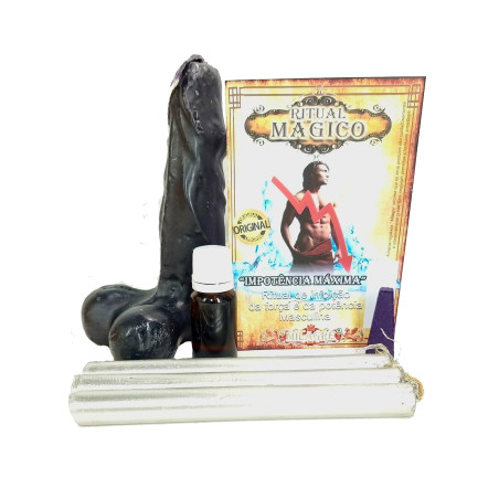 O ritual mágico impotência máxima é composto por uma vela figura (falo preto), um óleo ritualizado, uma barra de defumador, 3 velas prateadas de 15 cm, uma oração e instruções de utilização.